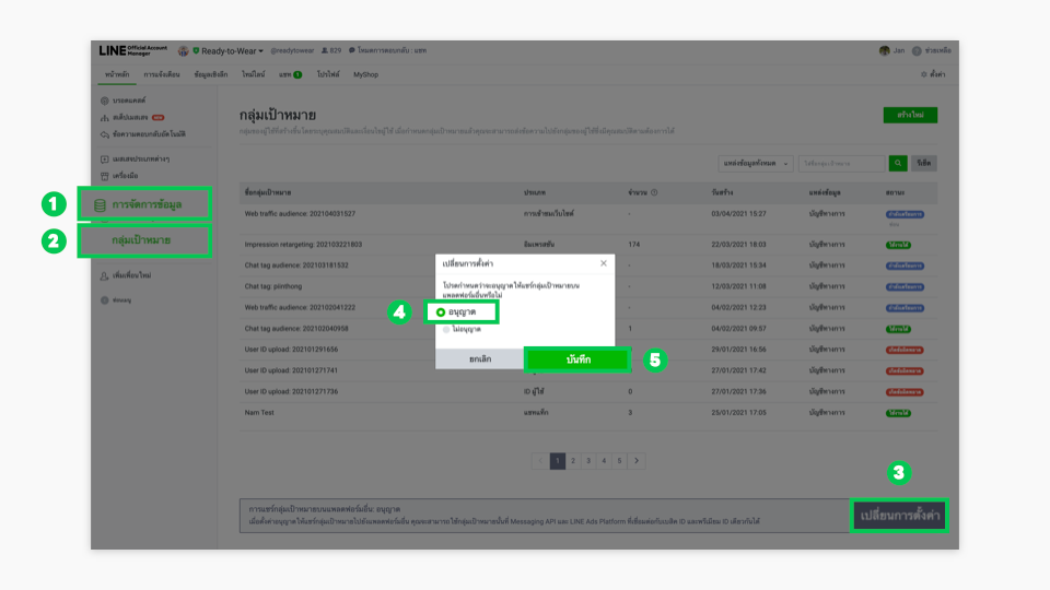 - เริ่มต้นจากการเข้าไปตั้งค่า “อนุญาต” (Public) ในการแชร์กลุ่มเป้าหมายบน LINE Official Account Manager (manager.line.biz) เพื่อเชื่อมโยงฐานข้อมูลลูกค้าก่อน