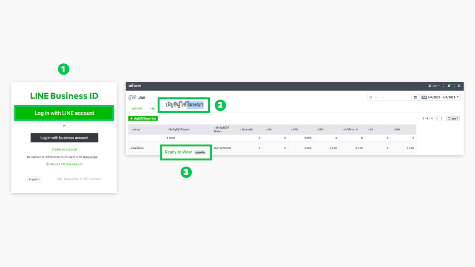- หลังจากนั้นเริ่มทำโฆษณา LINE Ads โดย Log in ที่ admanager.line.biz จากนั้น เลือก “บัญชีผู้ใช้โฆษณา” (Ad account) และ “ชื่อบัญชีผู้ใช้โฆษณา” (Ad account name) ที่สร้างไว้
