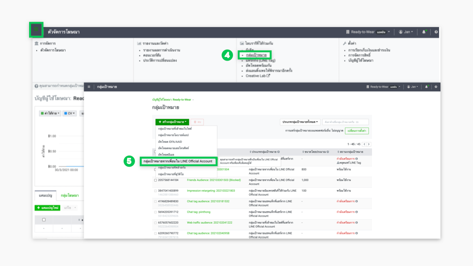 - เลือก “ขีด 3 ขีด” มุมบนซ้าย แล้วเลือก “กลุ่มเป้าหมาย” (Audience) ซึ่งจะปรากฎให้สร้างกลุ่มเป้าหมาย โดยเลือก “กลุ่มเป้าหมายจากเพื่อนใน LINE Official Account” (LINE Official Account Audience)