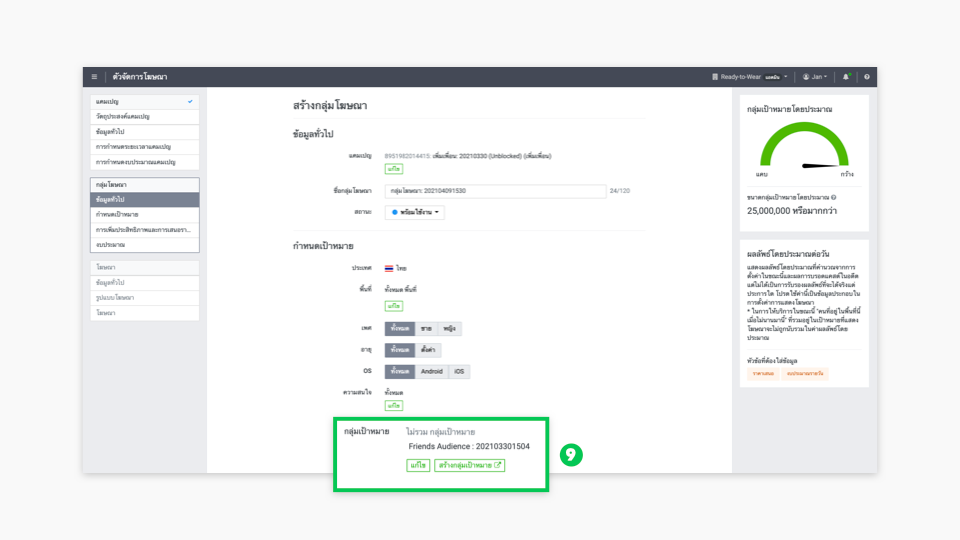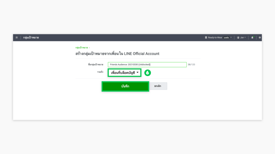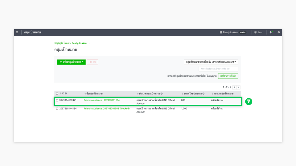 - กลุ่มเป้าหมายจากเพื่อนใน LINE Official Account ที่สร้างไว้จะแสดงในหน้ากลุ่มเป้าหมาย