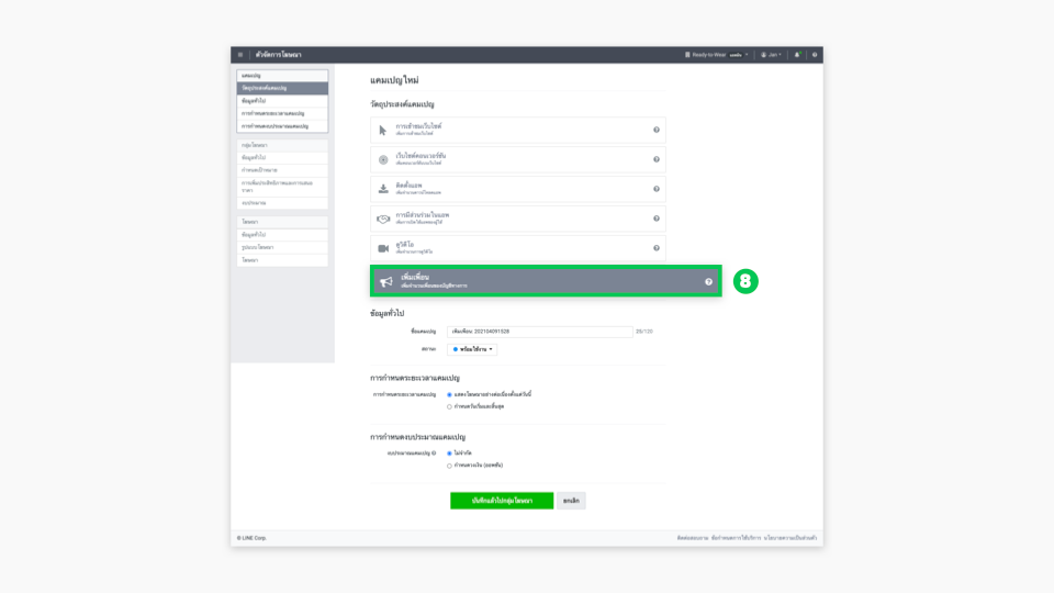 - ถัดมา คือขั้นตอนสำคัญในการทำโฆษณา โดยสามารถสร้างแคมเปญด้วยวัตถุประสงค์ “เพิ่มเพื่อน” (Gain friends) หรือ วัตถุประสงค์ “การเข้าชมเว็บไซต์” (Website visits) ก็ได้ และวางลิงก์ปลายทางเป็น LINE Official Account ของเรา หากต้องการให้กลับมาติดตาม LINE OA ของเราเหมือนเดิม