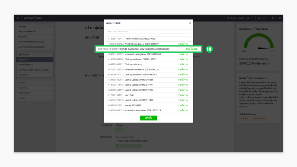 - คลิก “รวม” (Include) เพียงเท่านี้เป็นอันเสร็จสิ้น สําหรับการสร้างเป็นกลุ่มเป้าหมายในการทำโฆษณาของเราต่อไป เมื่อแคมเปญโฆษณายิงไปยังเพื่อนที่บล็อกบัญชี ก็จะสามารถกลับมาติดตามเราได้เหมือนเดิม หรือพูดคุยทางแชทได้ทันที