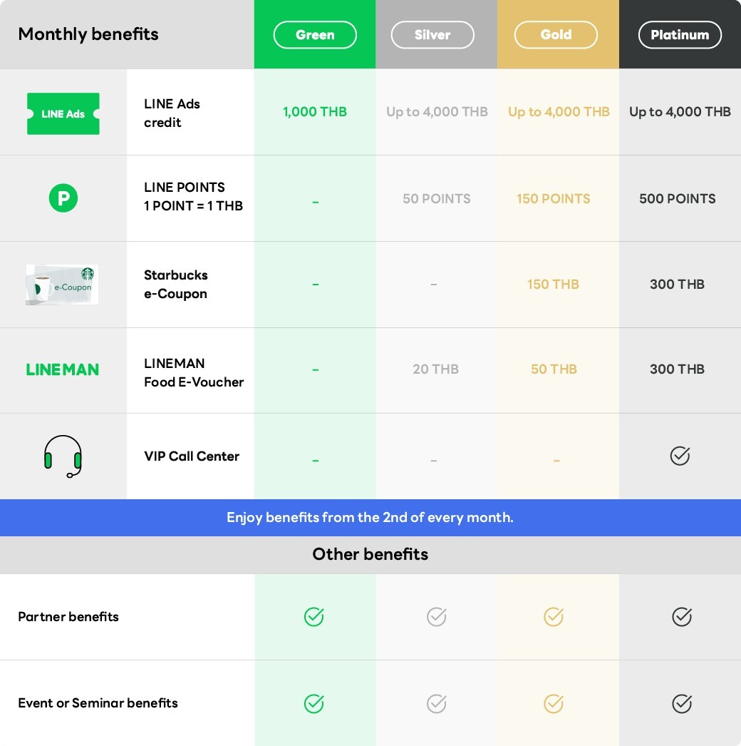 Membership is divided into 4 tiers based on the total spending on various LINE services. Every 1 baht spent equals 1 star, which is calculated based on the net spending amount (excluding VAT) across all services incurred during that individual month. Payments must be made directly by the member themself, not through agency partners. The spending amount that has been successfully paid will be converted into stars in the following month to adjust the membership tier accordingly.