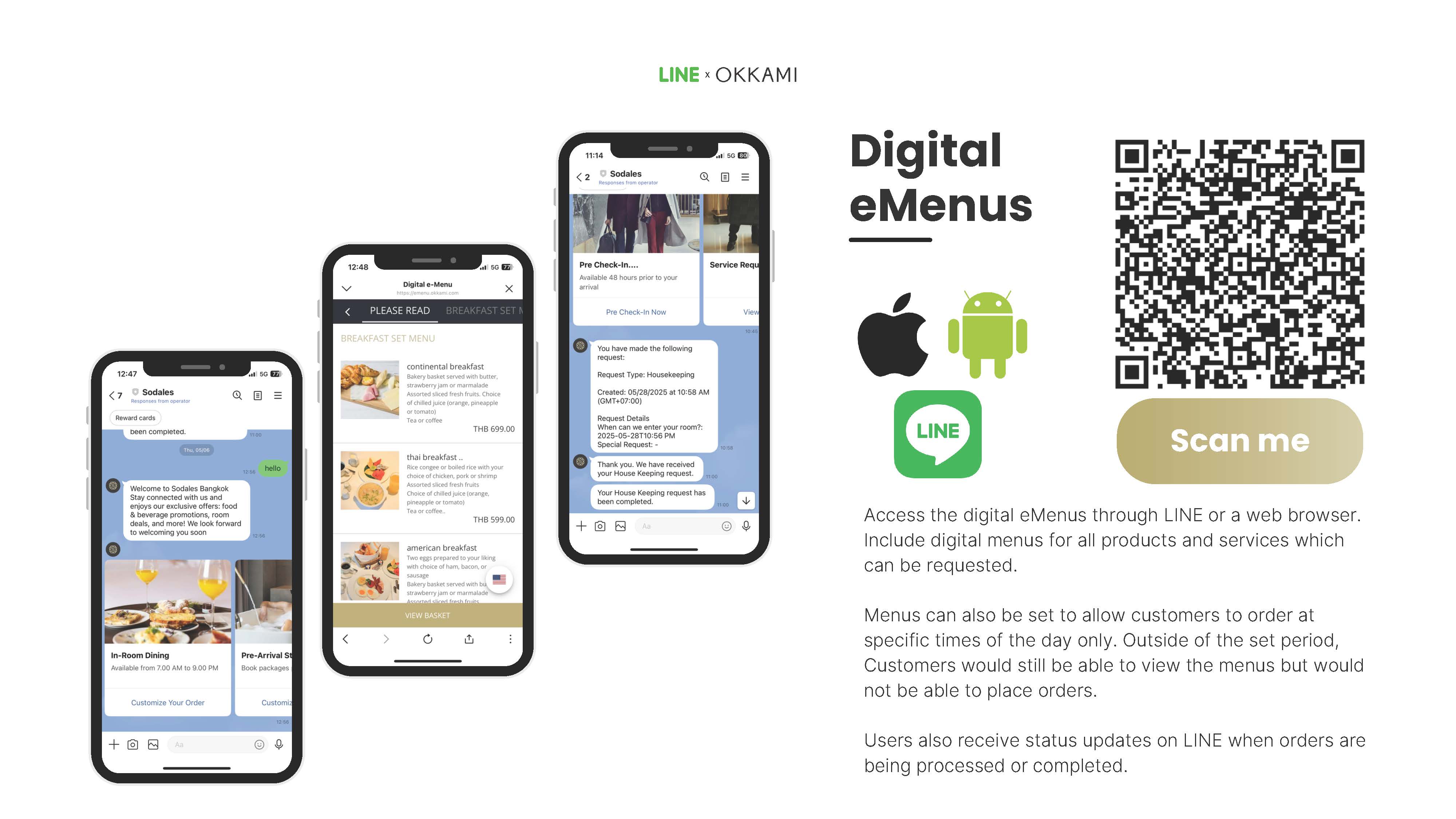 สร้างเมนูดิจิทัลพร้อมรหัส QR ที่ไม่ซ้ำกัน แขกสามารถสแกน QR Code เพื่อดูเมนูอาหารภายในห้องพัก หรือเมนูของ ร้านอาหารและบาร์อื่นๆ ภายในโรงแรม และหากเชื่อมต่อกับระบบ POS การสั่งอาหารสามารถดำเนินการได้โดยตรงและพิมพ์ออกมายังครัวโดยอัตโนมัติ ทำให้กระบวนการสั่งอาหารเป็นไปอย่างราบรื่น
