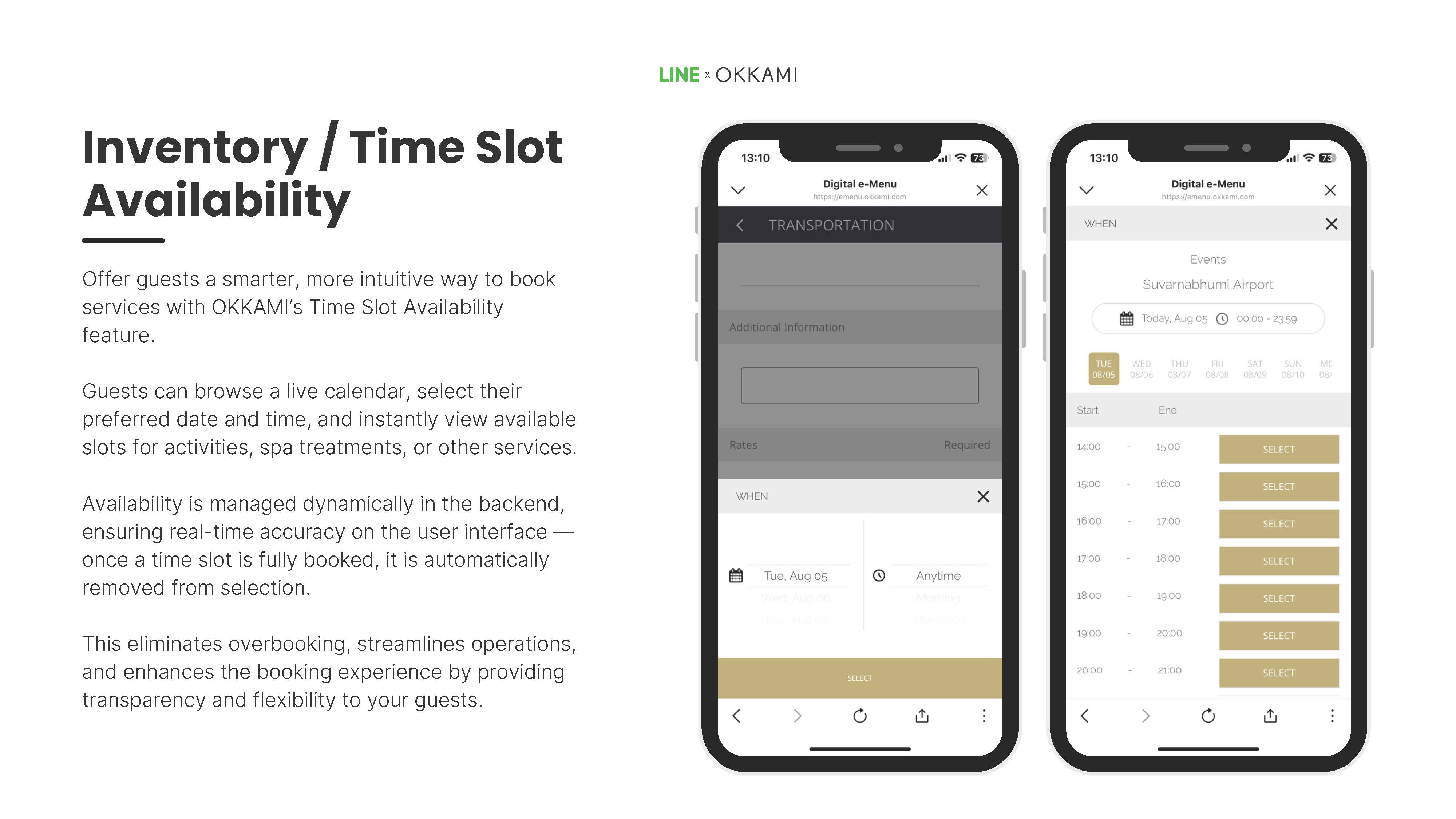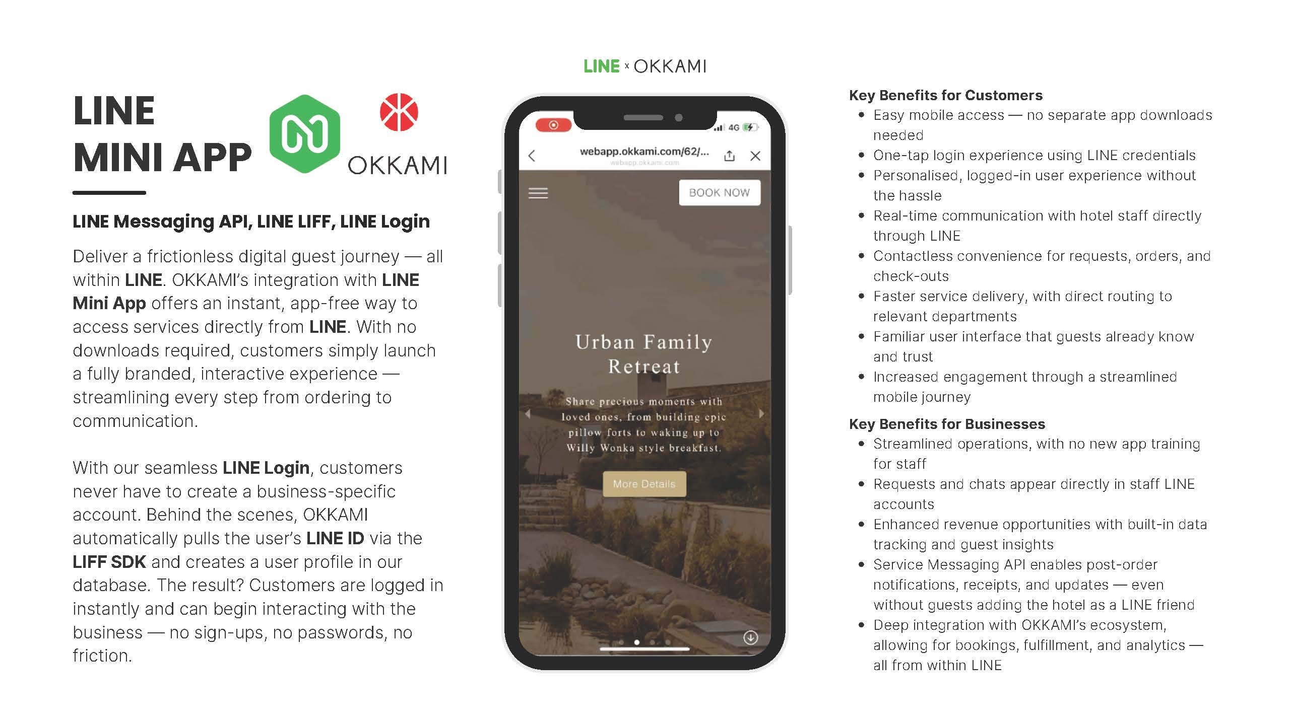 OKKAMI ปัจจุบันมีการเชื่อมต่อกับระบบของผู้ให้บริการด้านการโรงแรมชั้นนำกว่า 70 ราย ซึ่งช่วยให้เราสามารถมอบประสบการณ์ที่ราบรื่นแก่แขกและพนักงานโรงแรม ด้วยการวิจัยและพัฒนาแอปพลิเคชันนี้ เราสามารถนำเสนอแพลตฟอร์มที่ปรับแต่งได้ตามความต้องการของแต่ละธุรกิจการบริการ ด้านล่างนี้คือโซลูชันหลักของแพลตฟอร์ม OKKAMI