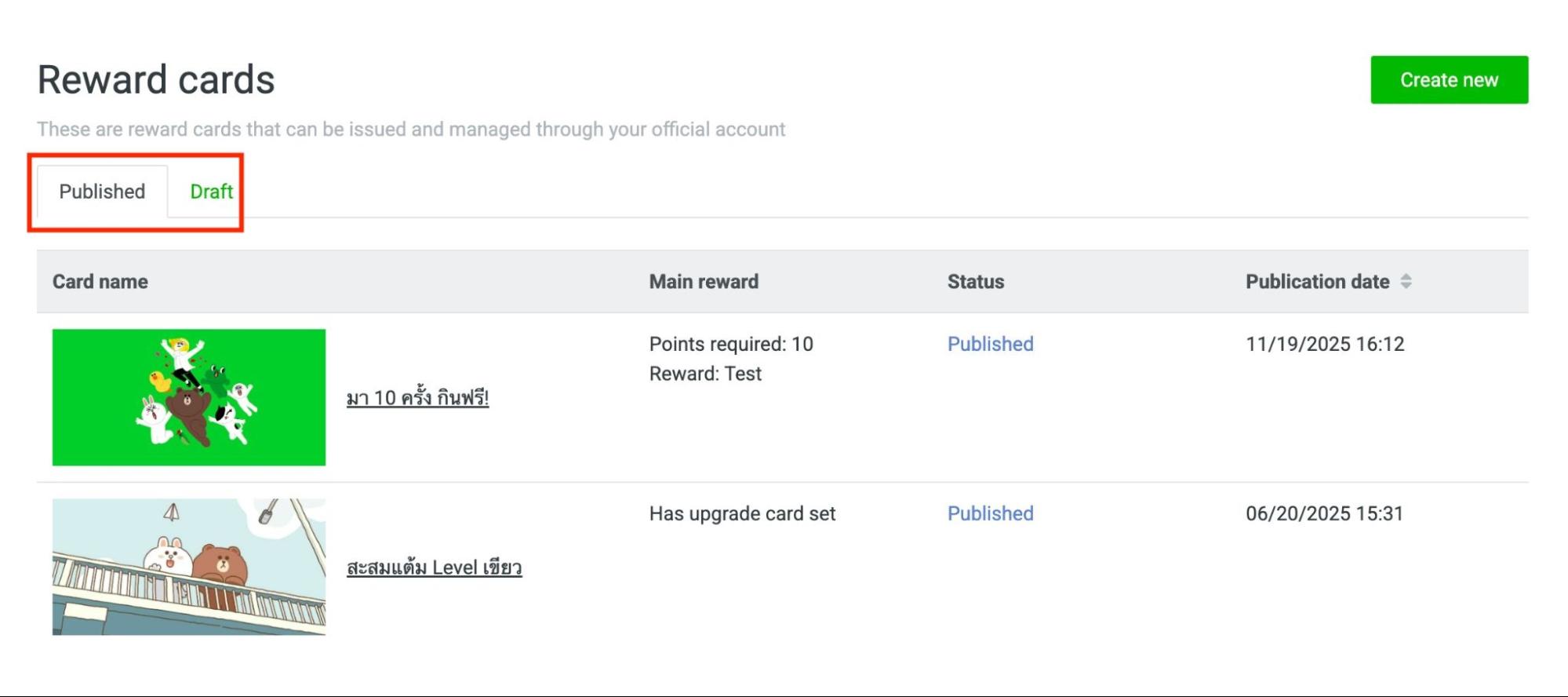 เมนู “บัตรสะสมแต้ม” ถูกปรับให้แสดงบัตรแยกตามสถานะอย่างชัดเจน ได้แก่ บัตรที่ใช้งานอยู่ (Published) และ บัตรที่เป็นฉบับร่าง (Draft)