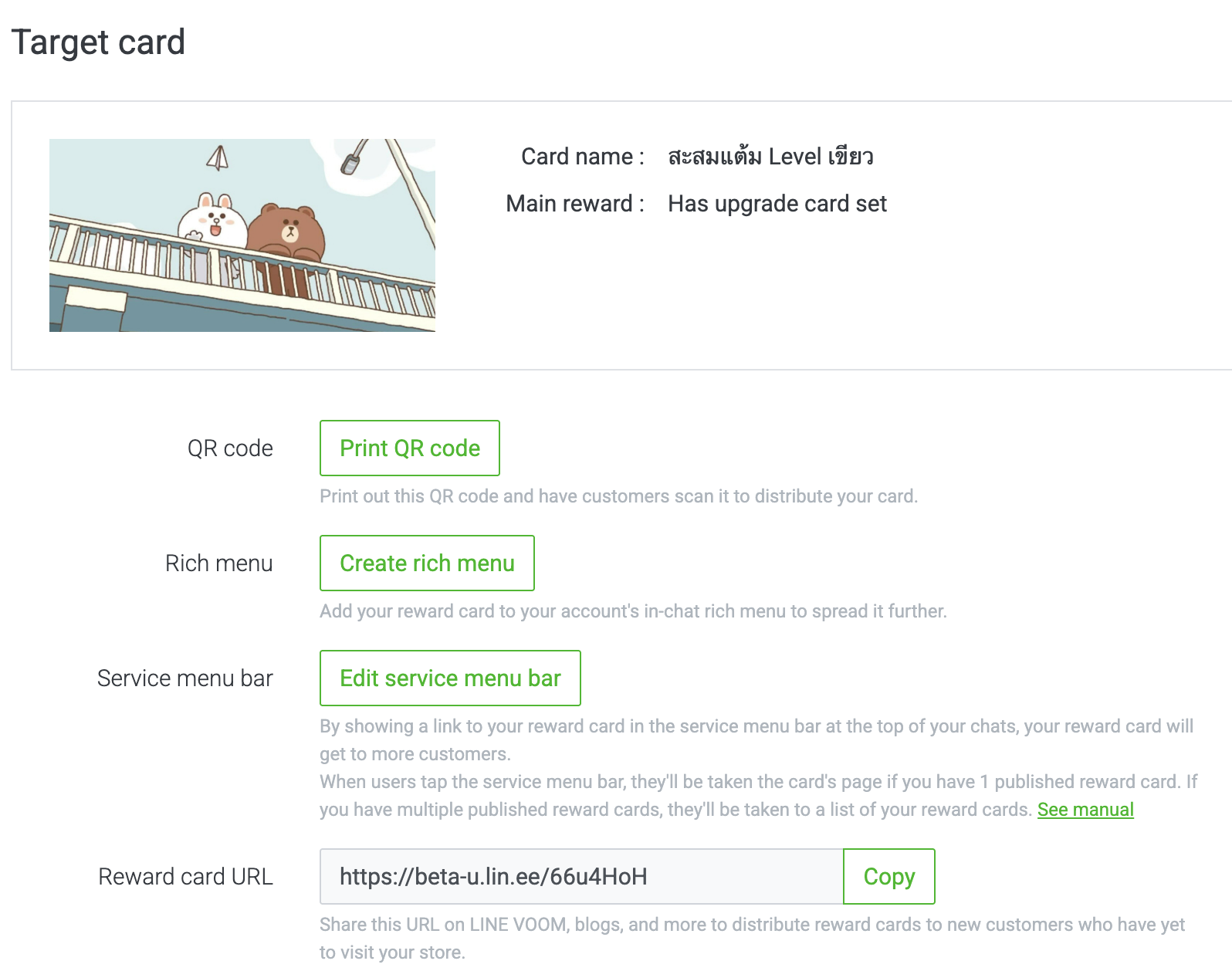 ร้านค้าสามารถสร้าง QR Code และ URL เฉพาะของบัตรแต่ละใบ ได้ทันที เพื่อใช้แจกให้ลูกค้ากดรับบัตรหรือสแกนผ่านสื่อของร้าน เช่น โปสเตอร์ หน้าร้าน โพสต์โปรโมชัน หรือใน Rich menu ช่วยให้กระจายบัตรสะสมแต้มได้สะดวกและเข้าถึงลูกค้าได้มากกว่าเดิม
