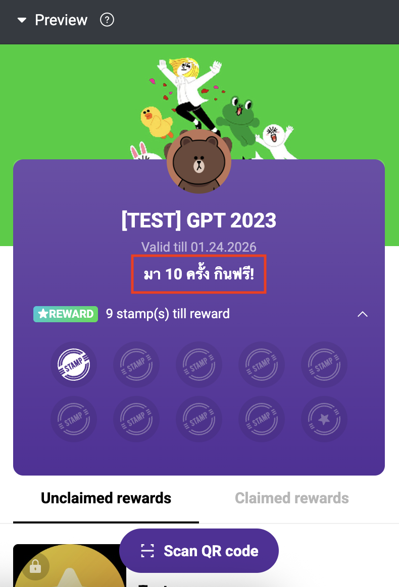 บัตรสะสมแต้มจะแสดงข้อความอธิบายรางวัลของแต่ละใบโดยอัตโนมัติ ช่วยให้ลูกค้าเห็นว่าบัตรนั้น “สะสมครบแล้วได้อะไร” ได้อย่างชัดเจนตั้งแต่หน้าแรกของบัตร ง่ายต่อการใช้งาน