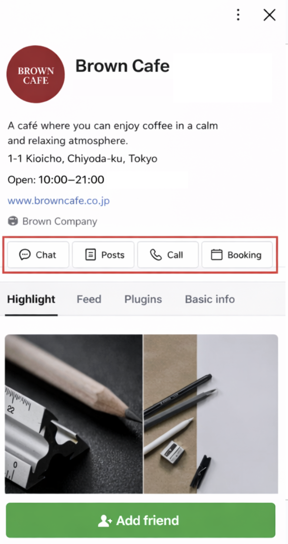 Action Button หรือ ปุ่มคลิก คือ ปุ่มที่แสดงบนหน้า Business Profile เพื่อช่วยให้ผู้ใช้งานเข้าถึงฟีเจอร์ต่างๆ ของร้านได้อย่างรวดเร็ว เช่น การแชท โทร ดูโพสต์ จองบริการ หรือใช้สิทธิประโยชน์ต่างๆ โดย Action Button ถือเป็นจุดสำคัญที่ช่วยกระตุ้นให้เกิดการกระทำจากผู้ใช้งานบนหน้าโปรไฟล์