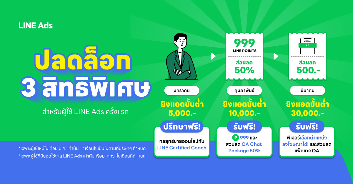 2. บริษัทสงวนสิทธิพิเศษสำหรับผู้ที่มีบัญชี LINE Official Account (“OA”) และเป็นผู้สมัครใช้งานบริการ LINE Ads รายใหม่ โดยต้องเป็นผู้ที่เปิดบัญชีโฆษณา LINE Ads เป็นครั้งแรก รวมถึงต้องปฏิบัติตามข้อกำหนดการใช้งานบัญชีทางการ และข้อกำหนดการใช้งานบริการ LINE Ads และบริการอื่นที่เกี่ยวข้อง ตามที่ระบุไว้ในลิงก์: https://lineforbusiness.com/th/terms-and-policies