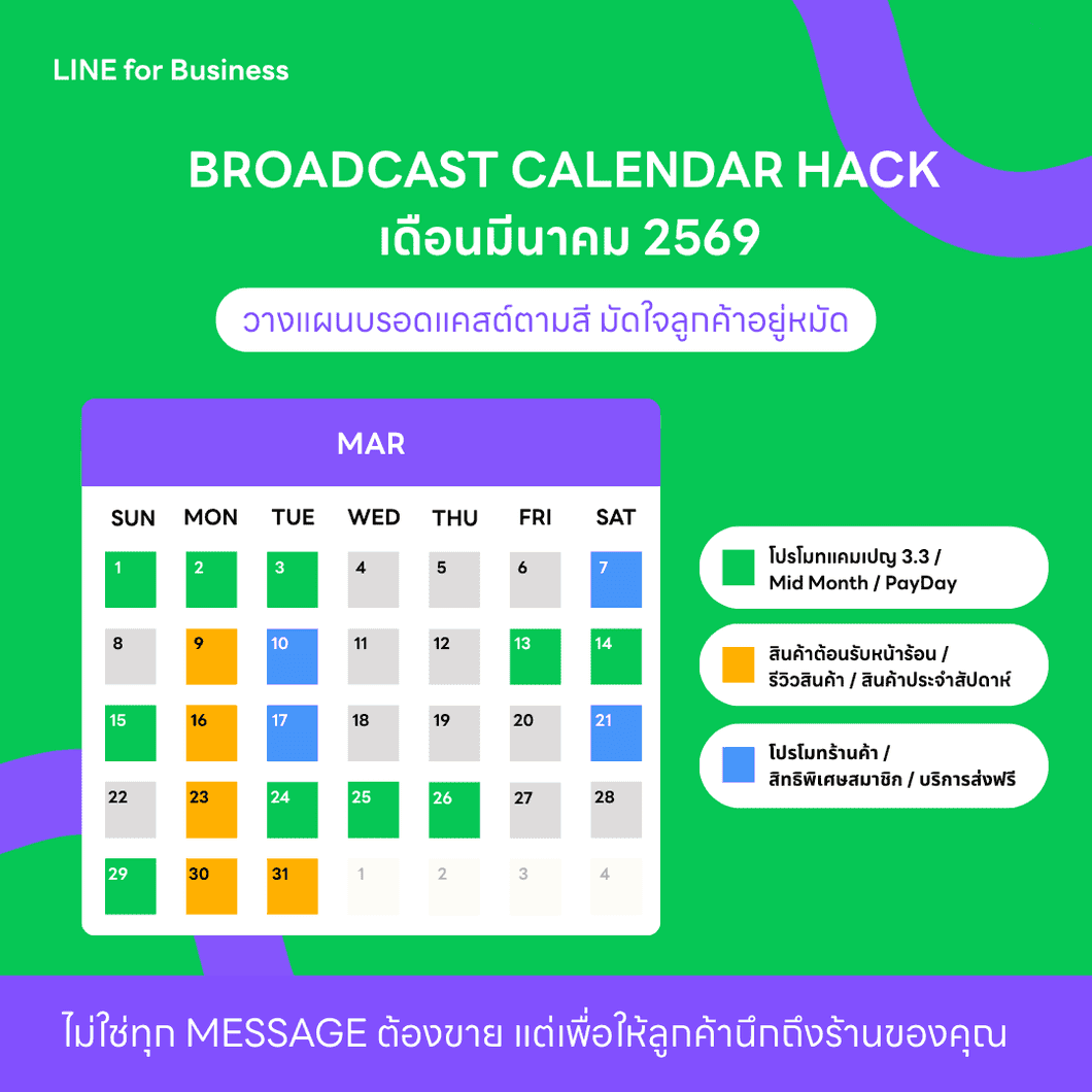 ขอเชิญชวนร้านค้ามาร่วมทำ Broadcast Mission เสริมสร้างพฤติกรรมการสื่อสารที่ดี สร้างสายสัมพันธ์ระหว่างร้านค้าและลูกค้า ทาง LINE แจกปฏิทินบรอดแคสต์ประจำเดือนมีนาคม พร้อม Tips & Trick ให้ฟรี! ลองเอาไปปรับใช้กันดูนะ