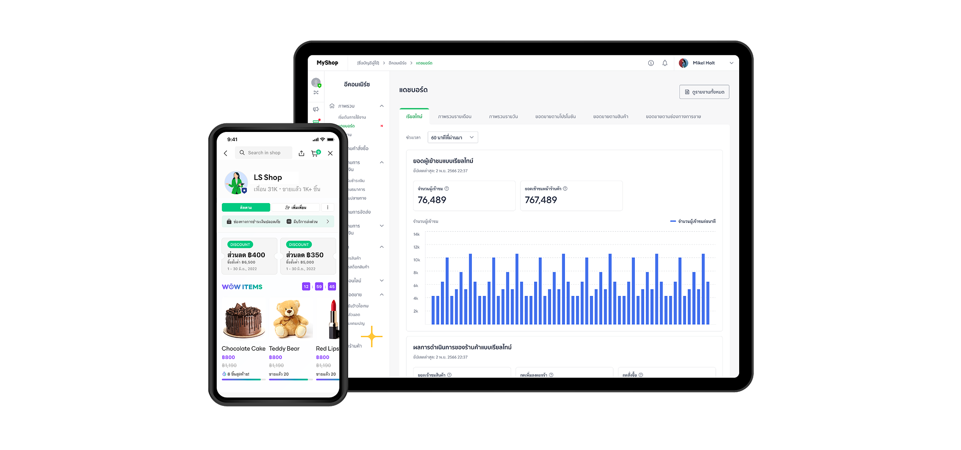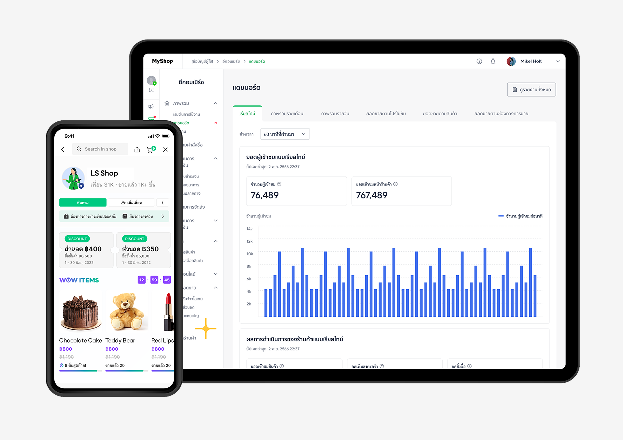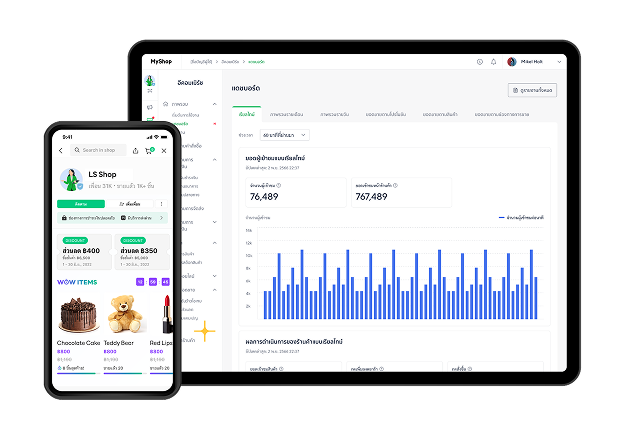 เครื่องมือจัดการร้านค้าหลังบ้านแบบครบวงจร เพื่อช่วยเพิ่มความสามารถในการขายของออนไลน์ให้กับร้านค้า ร้านค้าสามารถเชื่อมต่อเครื่องมือ MyShop ได้ 2 ช่องทาง โดยการโหลด Application MyShop บนโทรศัพท์มือถือ และ เปิดผ่านเว็บเบราว์เซอร์ (Web browser)