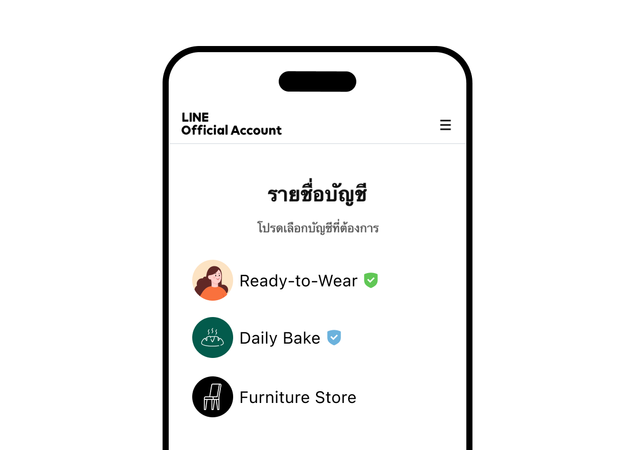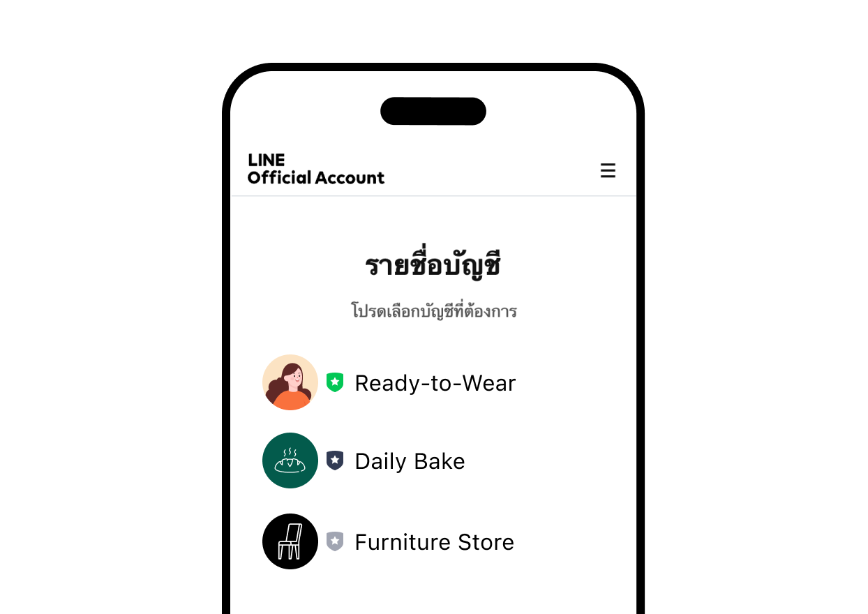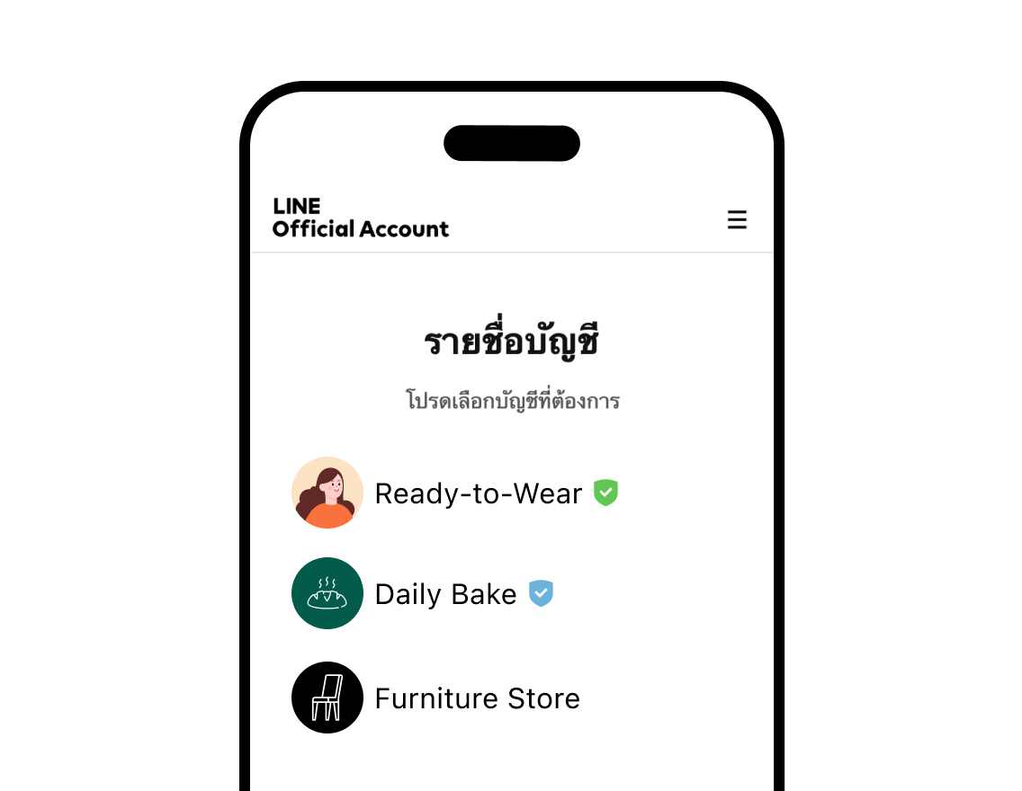 บัญชีทางการของ LINE ที่ช่วยให้ร้านค้าสามารถมีผู้ติดตาม สื่อสารกับลูกค้าได้อย่างใกล้ชิด เเค่พิมพ์คุยก็เริ่มขายของได้เเล้ว เเละยังสามารถส่งข้อมูลสินค้าภายในร้านของท่านไปยังลูกค้าได้อย่างง่าย รวมทั้งช่วยให้ร้านค้าสามารถบริหาร จัดการการขายได้อย่างมีประสิทธิภาพ เช่น การสร้างข้อความทักทาย ข้อความ ตอบกลับอัตโนมัติ คูปองและบัตรสะสมแต้ม การแชทแบบ 1-1 การบรอดแคสต์ หาผู้ติดตามทั้งหมด หรือการบรอดแคสต์แบบระบุกลุ่มเป้าหมาย เรียนรู้การเปิดร้านเพิ่มเติมได้ ที่นี่
